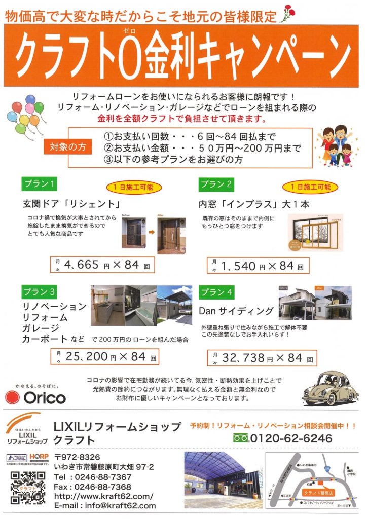 クラフトではただいま0金利キャンペーンを実施しております。