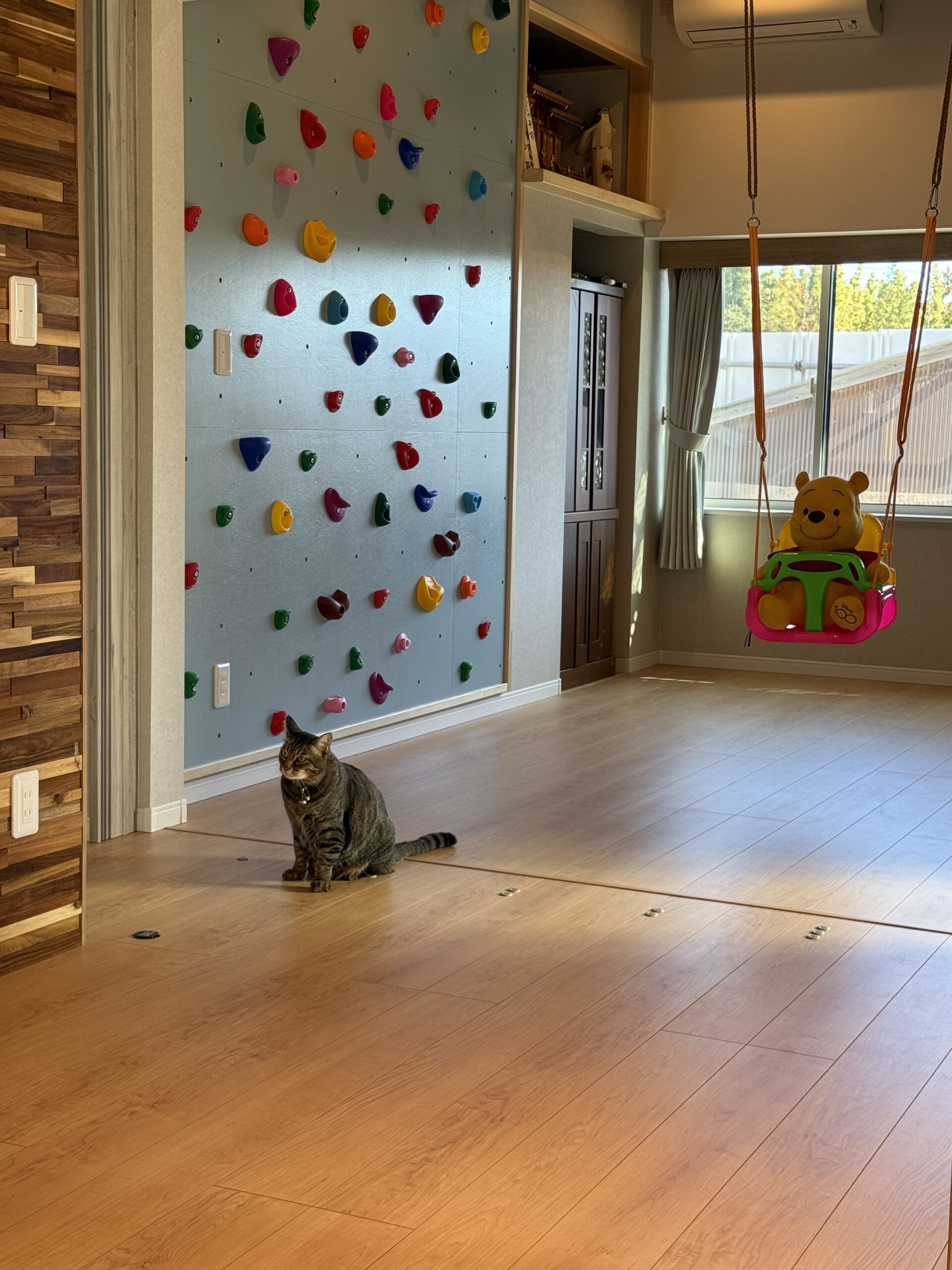 ☟プレイルーム→ボルダリングの壁、チョークでお絵かきができるクロス、ブランコがあります。