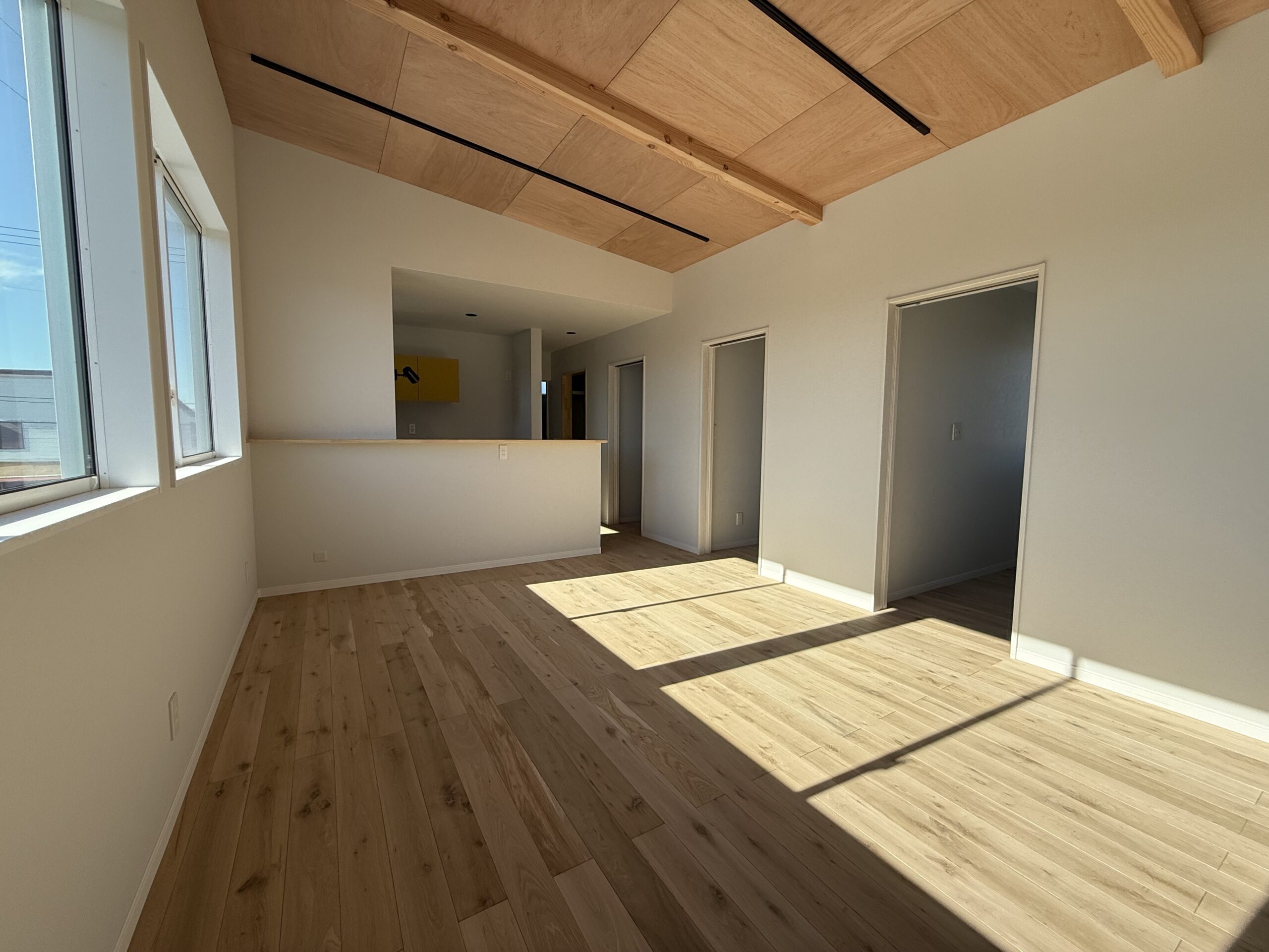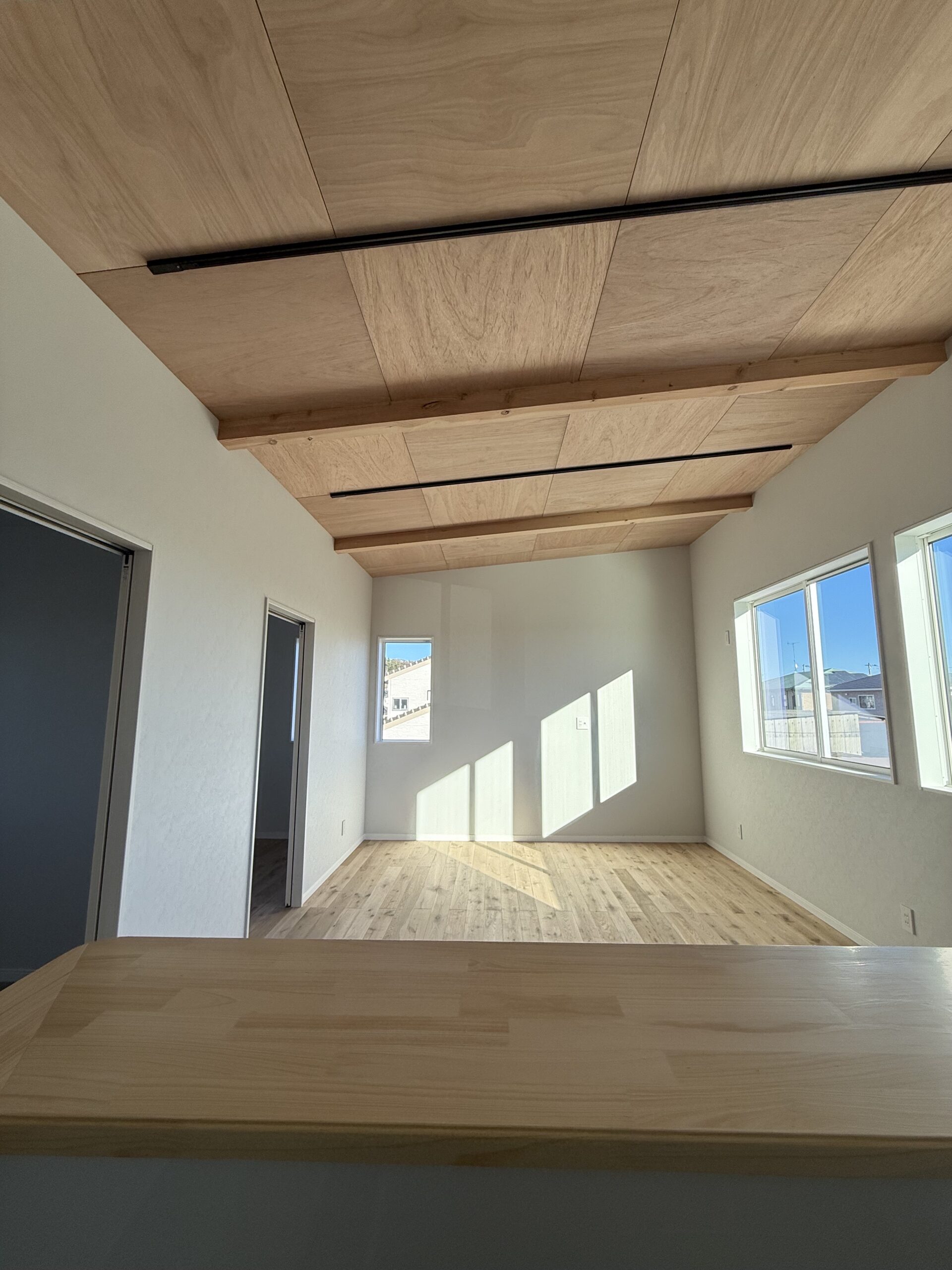 2階の居住部分は、勾配天井のLDKが家族の気配を感じやすい開放的な空間を演出し、オークの無垢材が日々の暮らしに安らぎを与えます。