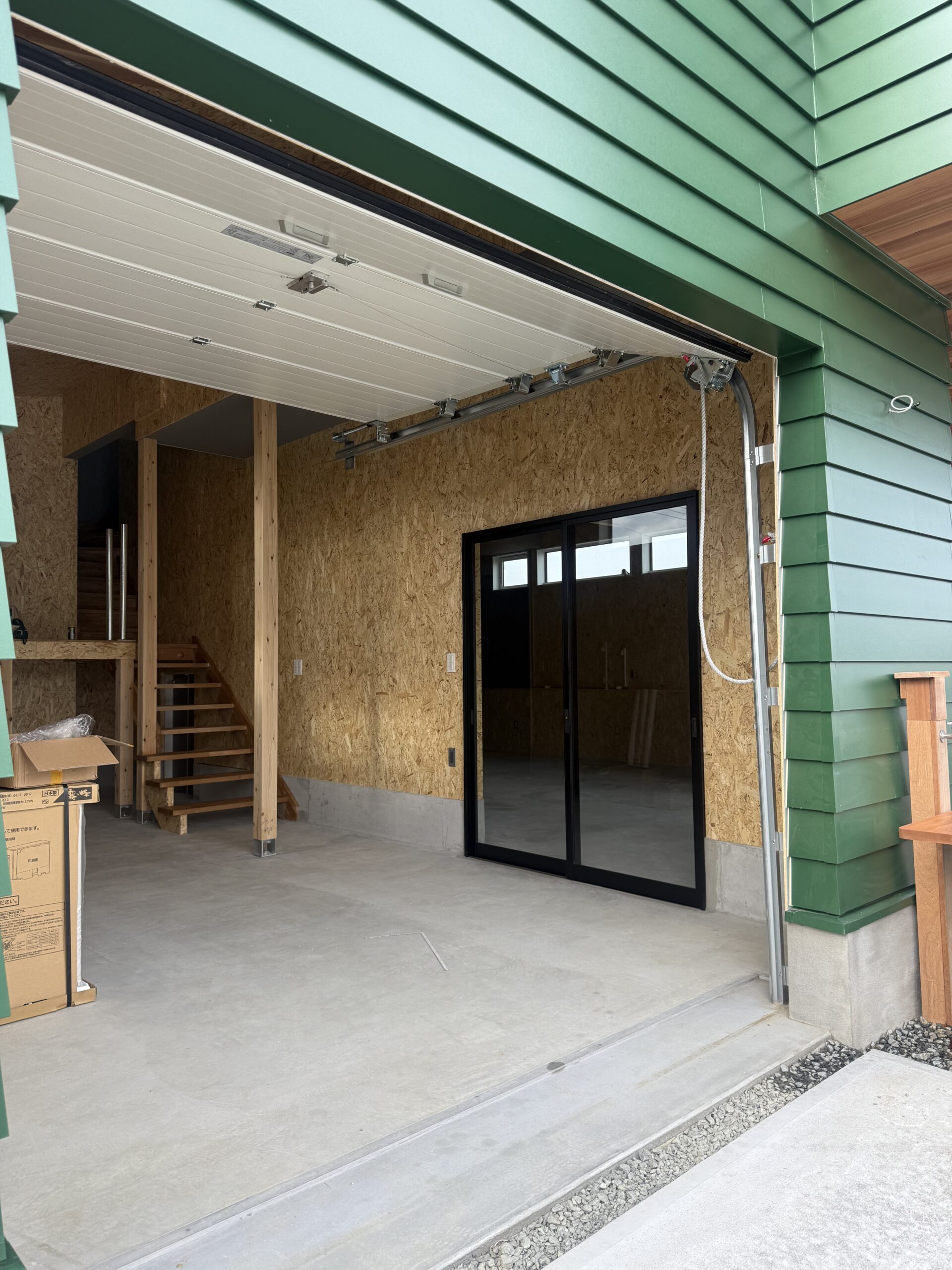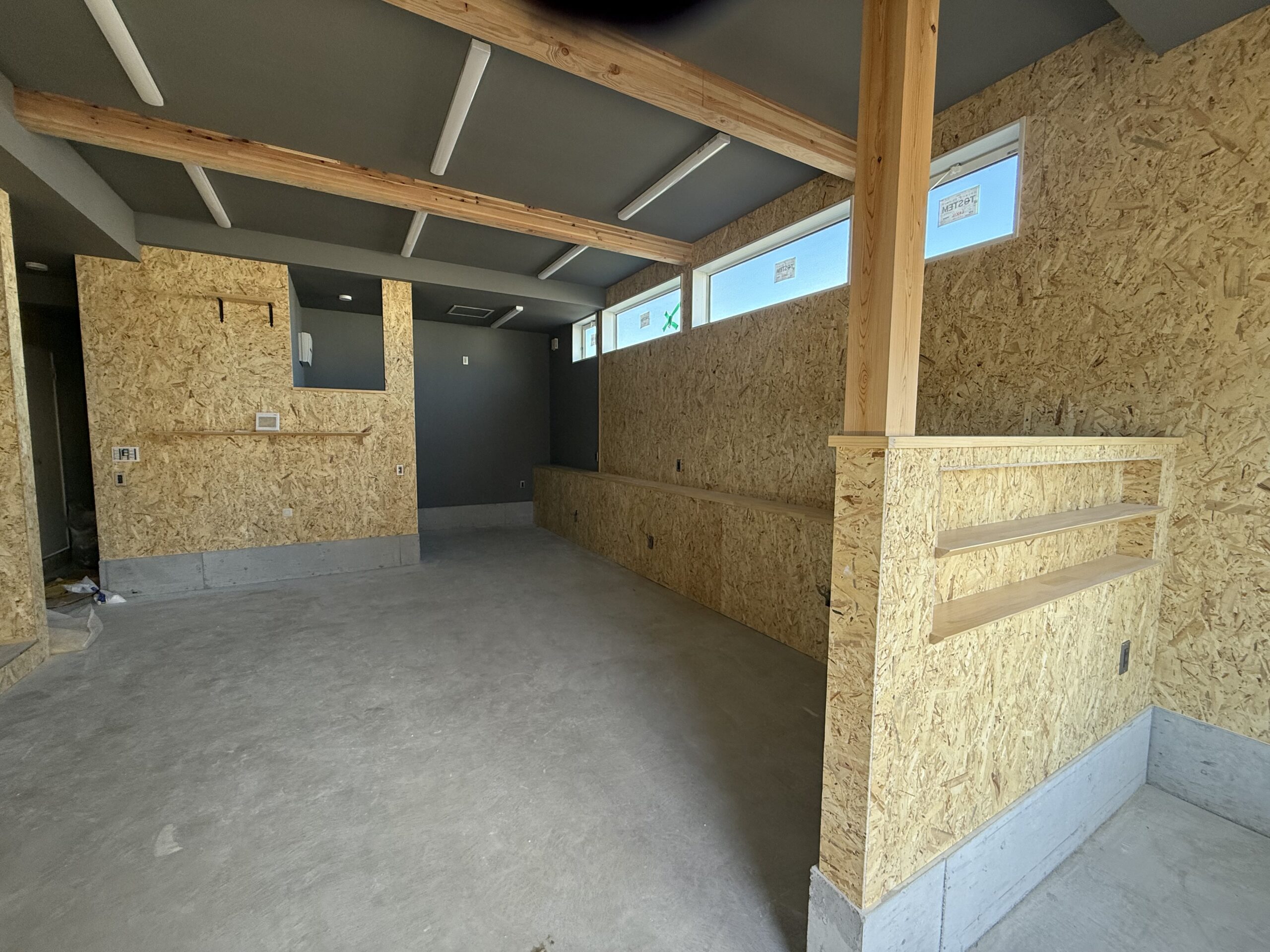 ガレージはオーバースライダーシャッターを採用し、内部はOSB合板で仕上げた無骨な空間に仕上がっています。